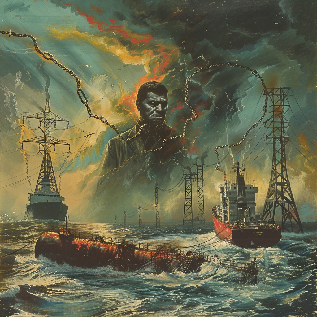 Prompt: A distressed oil tanker in the Baltic Sea secured amidst criticism towards Putin, Venezuelan President Maduro inaugurated for a third term, and US imposes new sanctions on Russias energy sector. Visualize a dramatic seascape under a turbulent sky with an oil tanker in the foreground, a looming figure symbolizing Maduro in the background, and energy towers entwined with chains representing sanctions.