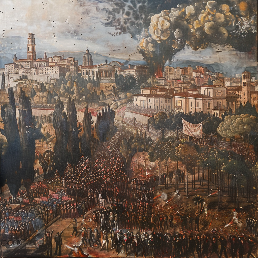 Prompt: Ceasefire in conflict, massive protest in urban landscape, parliament intrigue, symbolizing hope and tension.